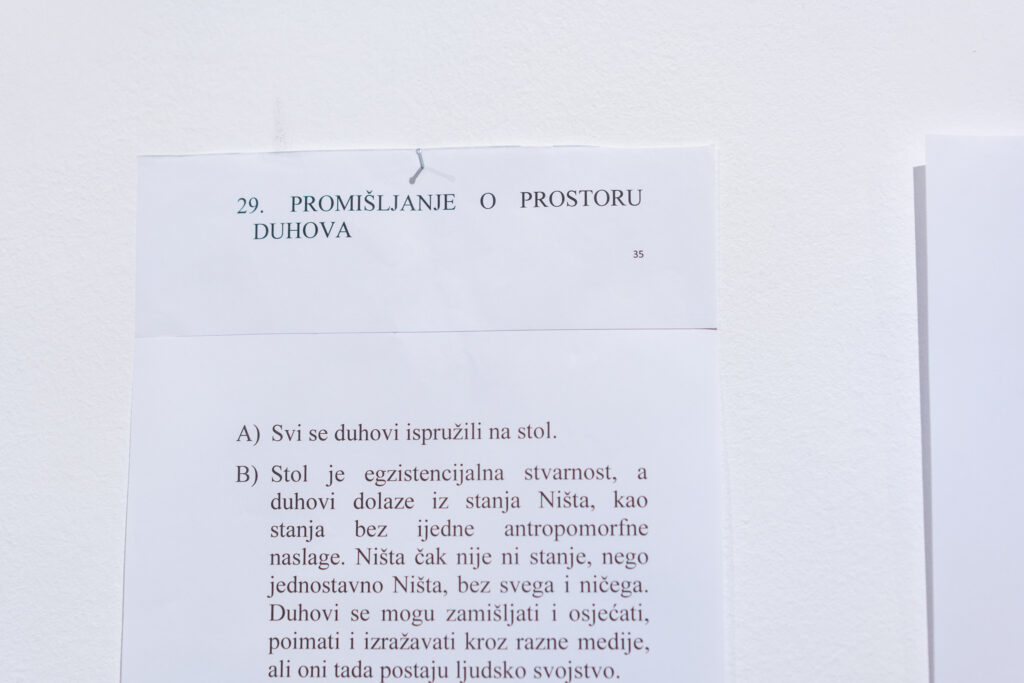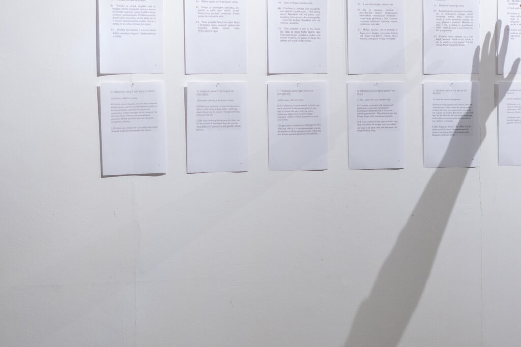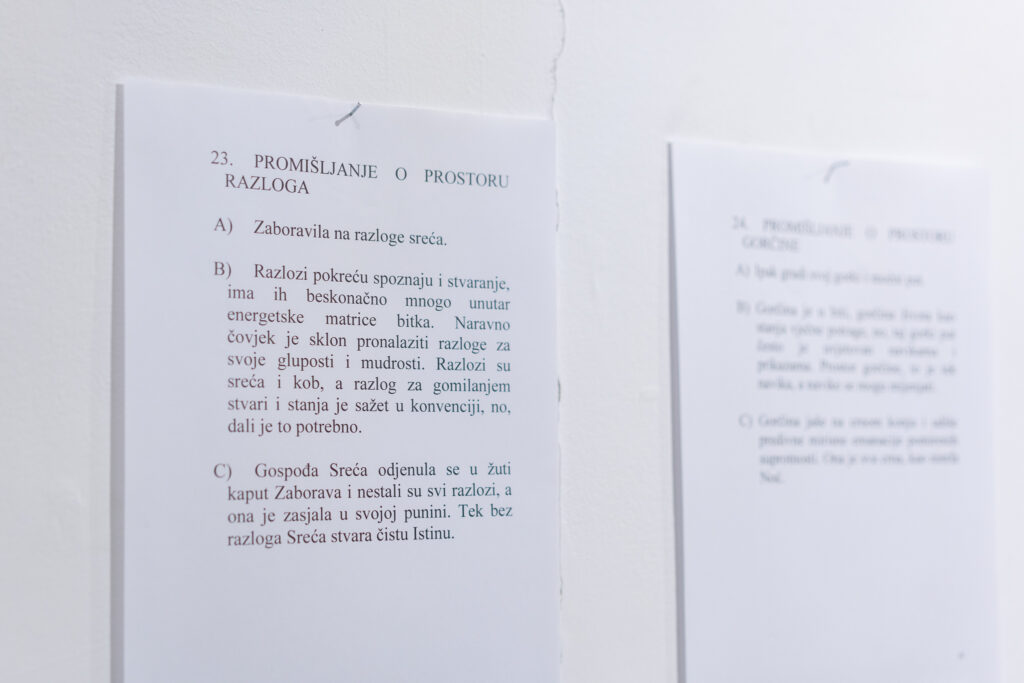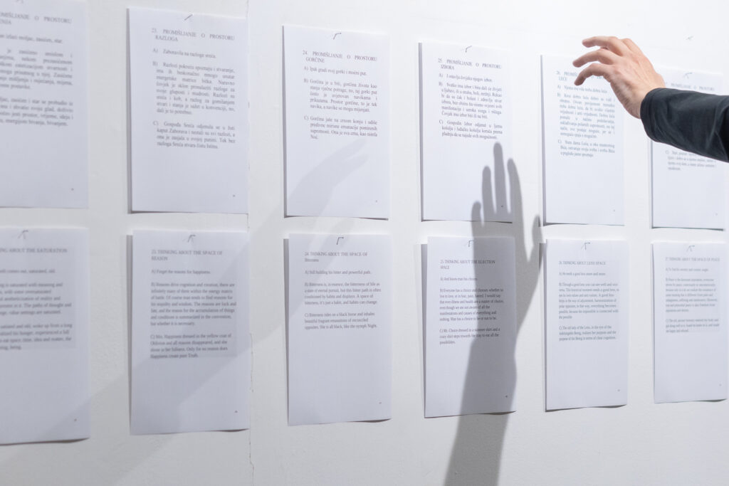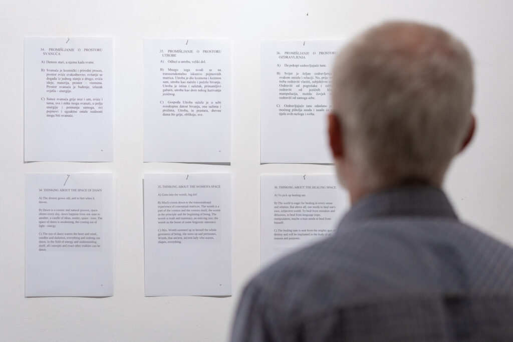 Radovi na ovoj izložbi pokušavaju reflektirati sintezu života i umjetnosti, a pomoću poetskog spontanog glasovnog artikuliranja (performanse) autor transponira crteže u i kroz hiperjezik, dok spontanim pokretima tijela proširuje i formira transpozicije prostora. Ta tekstualna promišljanja o raznim metafizičkim aspektima prostora preuzeta su iz njegove zbirke pjesama „Ulovljene zvijeri“ koja, prezentirana na postamentu kao izdvojeni rad, također čini dio izložbe.