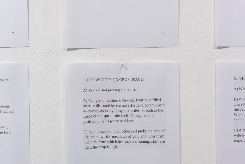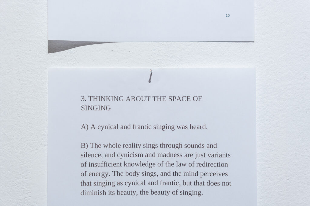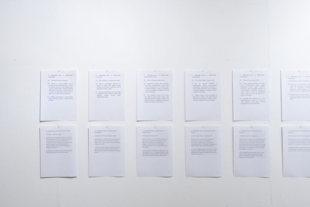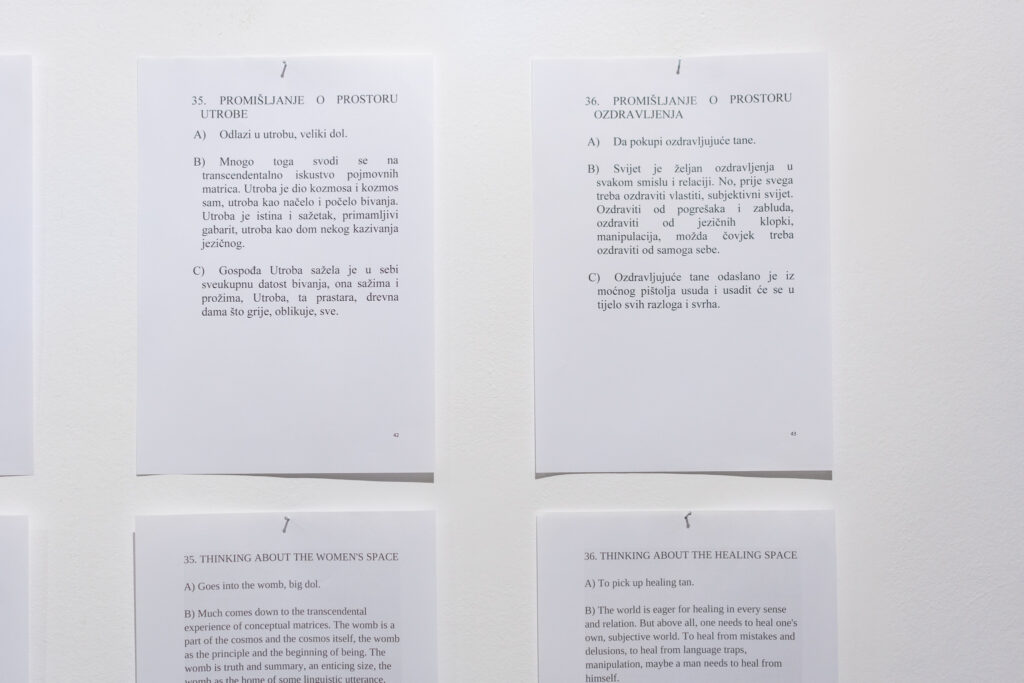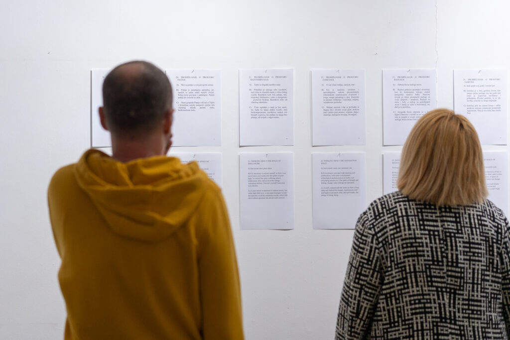 Radovi na ovoj izložbi pokušavaju reflektirati sintezu života i umjetnosti, a pomoću poetskog spontanog glasovnog artikuliranja (performanse) autor transponira crteže u i kroz hiperjezik, dok spontanim pokretima tijela proširuje i formira transpozicije prostora. Ta tekstualna promišljanja o raznim metafizičkim aspektima prostora preuzeta su iz njegove zbirke pjesama „Ulovljene zvijeri“ koja, prezentirana na postamentu kao izdvojeni rad, također čini dio izložbe.
