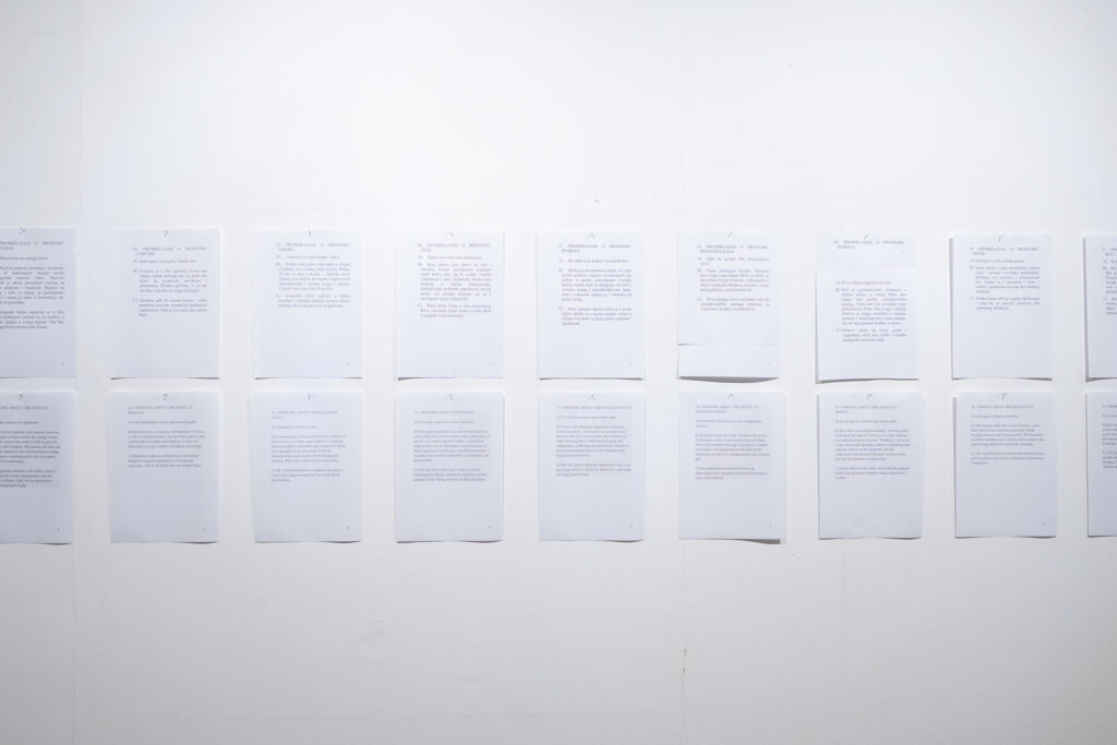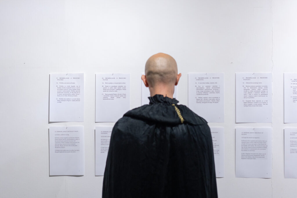 Izložbu čini 36 tekstualno – konceptualnih crteža/slika iliti slikarskih instalacija sastavljenih od dva pojmovna crteža (jedan na hrvatskom jeziku, jedan na engleskom). Uz svaki od crteža, autor je izveo po jedan performans. Performansi su sastavni dio ciklusa performansa „Crni plašt“, unutar cjeloživotnog permanentnog energetskog performerskog svjedočanstva „Organizam žive umjetnosti“.