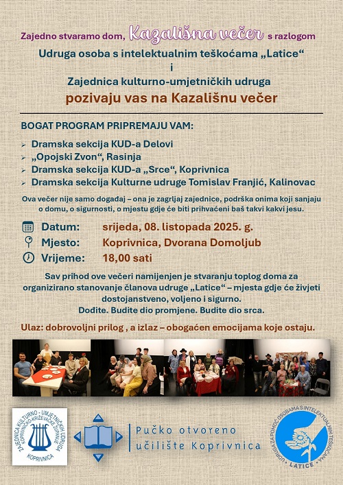 Udruga osoba s intelektualnim teškoćama „Latice“ i Zajednica kulturno-umjetničkih udruga pozivaju vas na Kazališnu večer