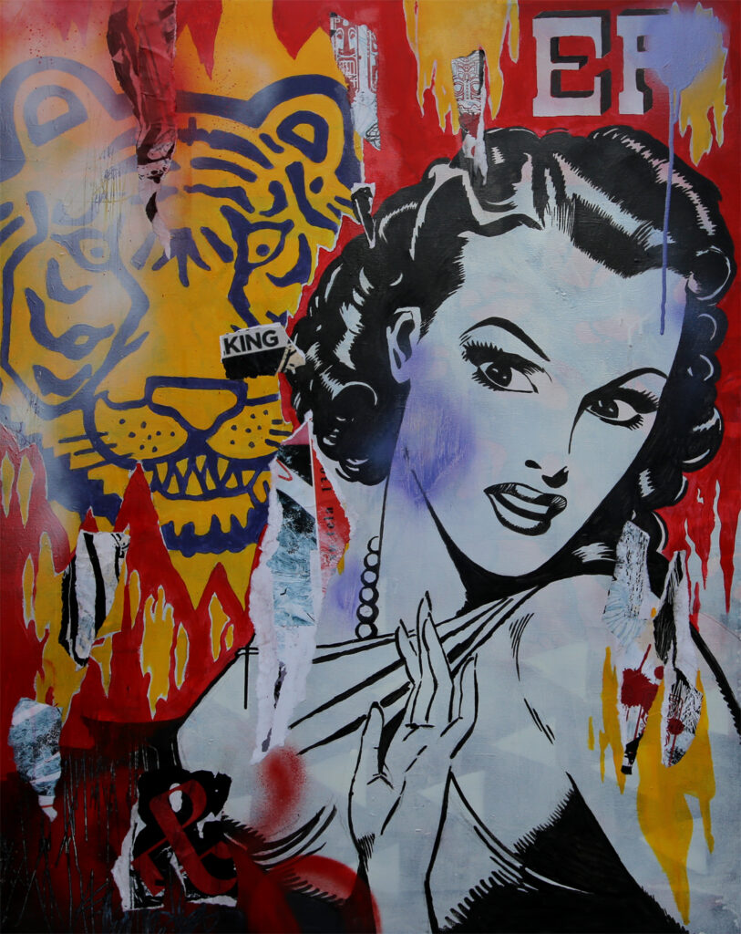 MGK-24599 – Zvonimir Haramija, Dale & Tiger, 2014., akril, kolaž, sprej/drvo, 800×600 mm (arhiva Muzeja grada Koprivnice)