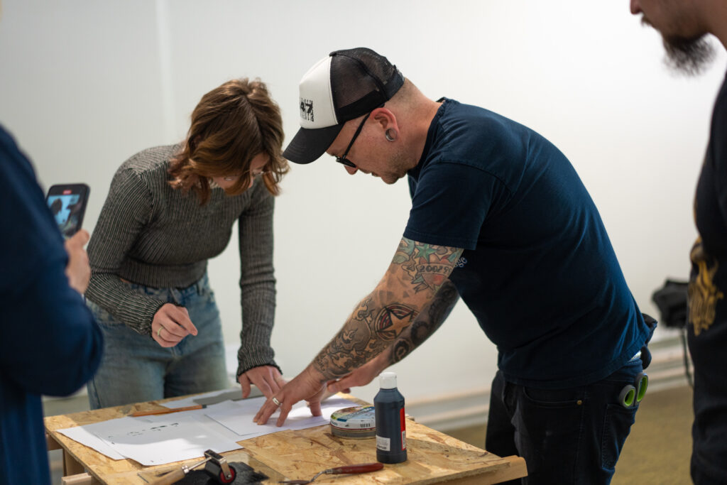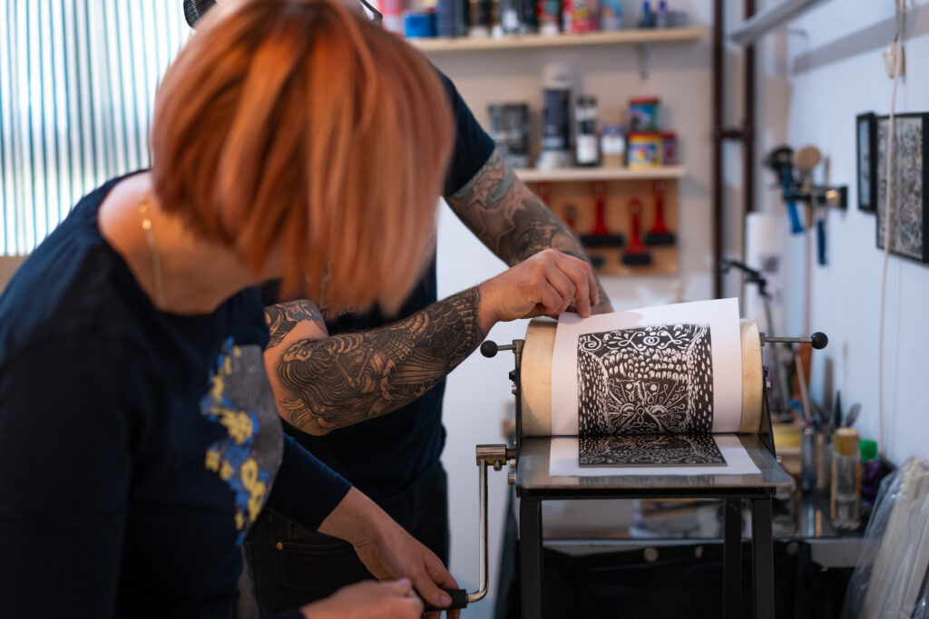 – Osnove otiska (objasniti proces ispisa, uključujući odabir i pripremu papira; voditi sudionike u nanosu tinte na njihove blokove linoleum; pomoći oko stvaranja prve serije otisaka)
