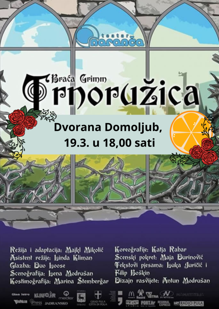 Napokon se kralju i kraljici rodila kćer, Aurora, a kralj je toliko zbunjen da je zaboravio pozvati zlu vilu na proslavu. Uvrijeđena zla vila odlučuje kazniti Auroru tako što je proklinje: na svoj 16 rođendan na staro će se nabosti vreteno i srce mlado bit će ugašeno. Dobre vile ublažavaju kletvu i skrivaju Auroru pod imenom Trnoružica. Rasplet čarobne price o Trnoružici i kako je dobro pobijedilo zlo pogledajte u našoj dvorani Domoljub.